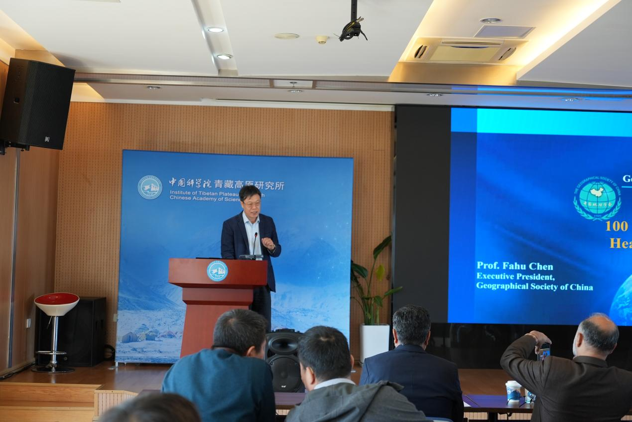 在交流环节,陈发虎院士以“卓越百年,迈向未来”为题,介绍了中国地理学会的百年发展历程与重要贡献,展望了未来的合作方向。随后,侯居峙研究员概要介绍了“古生态与人类适应团队”的主要研究方向、科研进展及团队建设的情况。